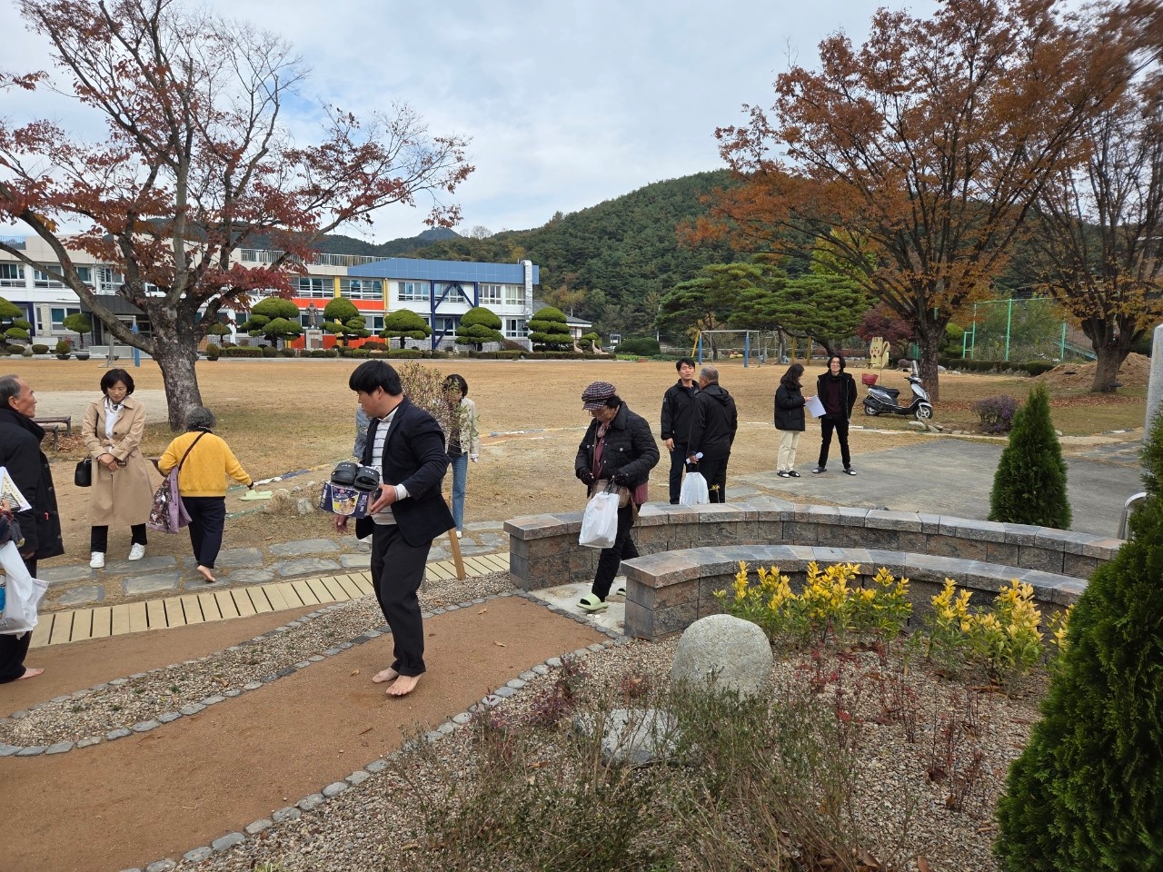 11월 12일(수) 어울터 및 맨발걷기공원에서 지곡면 기관단체협의회 대표 및 관내 교원을 초청하여 개방형 학교공간 조성사업 준공식을 가졌습니다. 어울터에 VR체험실을 설치하고 기존 맨발걷기코스에 맨발공원을 추가로 조성하였습니다.